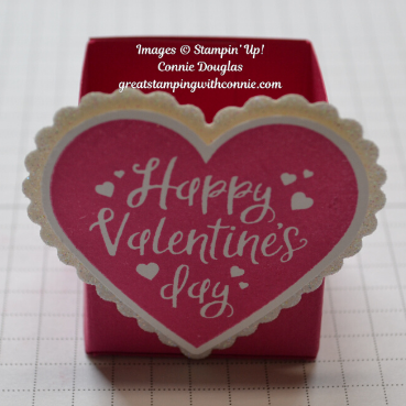 To decorate your box, use the Happy Valentine’s Day stamp from the Heartfelt Bundle, stamped on Whisper White card stock with Melon Mambo ink. Use the plain heart from the Heart Punch Pack to punch out. Punch a ruffled heart from the Punch Pack from Sparkle Glimmer paper.
