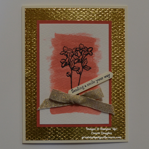 Our results on this card were not spectacular, as the flowers bled quite a bit where the paper was rather wet. It was fun to try, and in card making there are no mistakes, only opportunities. I simply adhered the sentiment over the part that had bled the most, and the card turned out fine!