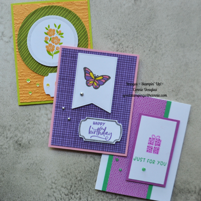 I used Stampin’ Write markers to colour this pretty butterfly. The Designer Series Paper on these two cards is from the Flowering Zinnia’s pack. This card pairs the new In Color Pretty In Pink with Highland Heather.
