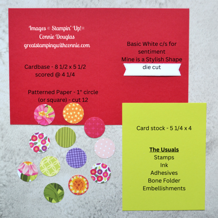I love to share fun ways to create cards using small scraps since we always have lots of those around. I used a circle punch to make 1” circles, but you could also use another small shape of punch or die. You could also cut squares, the options are endless.