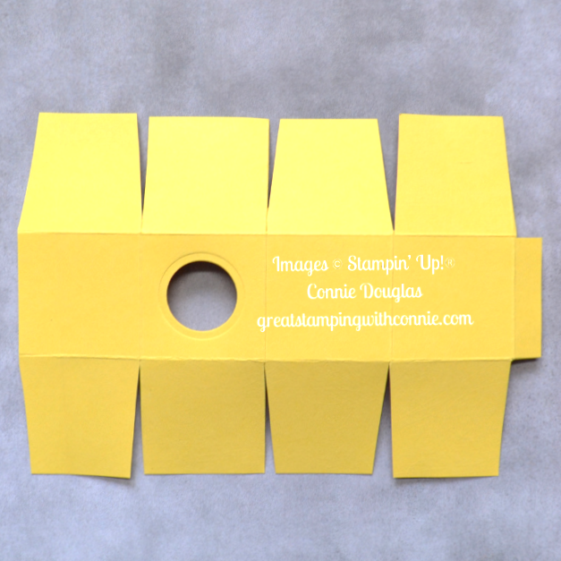 To make this, start with a piece of card stock that is 8 1/2 x 6 inches. Score on the long side at 2, 4, 6, and 8, and at 2 and 4 on the short side. Cut the edges as shown in the photo, and die cut a circle for the glue bottle to sit in.