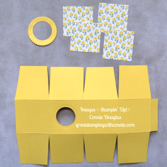 Before you assemble the box, add DSP pieces to the outside edge panels. Cut 4 pieces of DSP 1 3/4 x 1 3/4 for this. I also painted Wink of Stella on the reinforcing circle for a little extra shine.