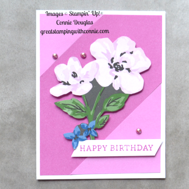 The background for this card is Two-Tone Petunia Pop cardstock. I cut the two corners, and turned them over for a fantastic two tone effect. The flowers are fussy cut from Lovely Garden Designer Series Paper for a quick and stunning card.