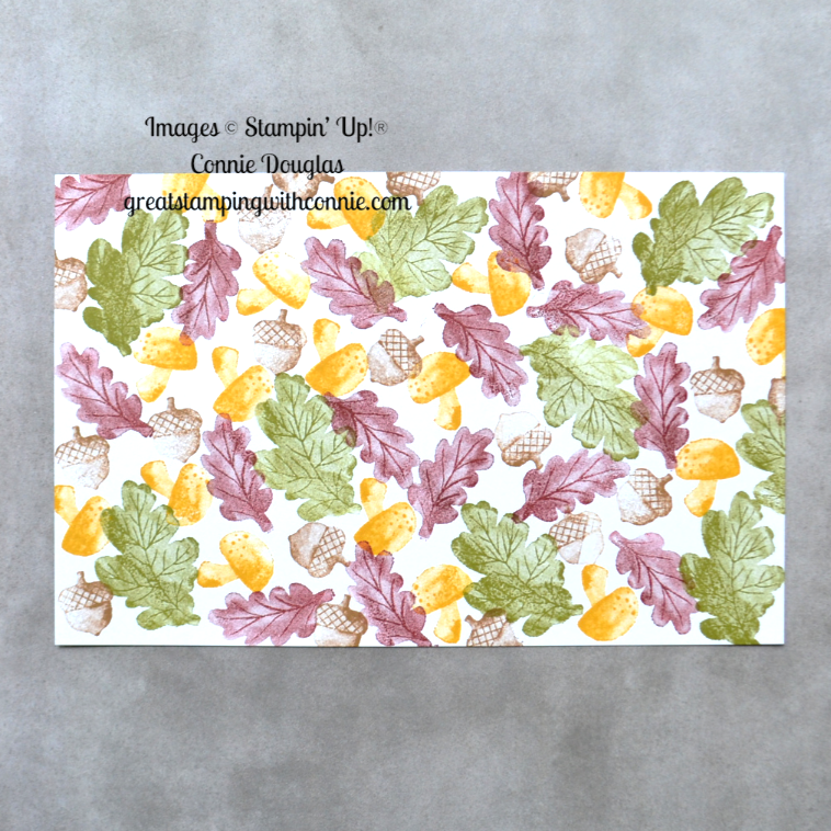 I used Old Olive, Cherry Cobbler, Crushed Curry and Pecan Pie to create this DSP. When you do this technique it is a good idea to use one stamp per colour to avoid mistakes and mixing your colours in the wrong ink pad! Start with the largest image and work down in size through the stamps you have selected. You can always go back and fill in gaps as needed after the first pass.