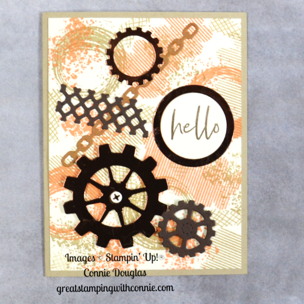 All the texture stamps just make we want to create my own Designer Series Paper, so that’s what I did. I used Timid Tiger and Crumb Cake ink for this card. Just two colours to create such a fun background. I die cut some gears and other elements, including the pieces for the sentiment and frame.
