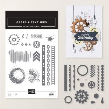 I love the new bundle Gears & Textures. There are lots of great texture stamps along with some neat gears, and the dies cut all sorts of gears and cogs and fun mechanical things!