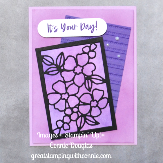 For this card I used the die cut as a mask, and added colour with Sponge Daubers. In the video you can see what it looked like without the black. That would have made a nice card, but the black did add a fantastic pop so we went with the extra layer!
