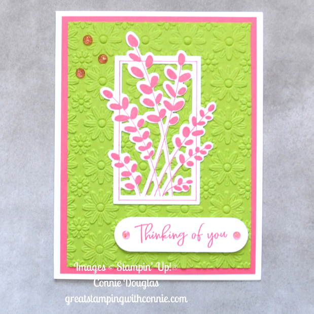 For this card I had a die cut from Friendly Foliage that was perfect to go on my Granny Apple Green embossed cardstock.